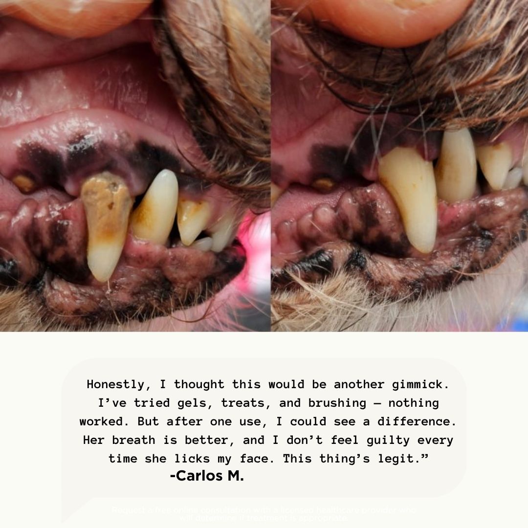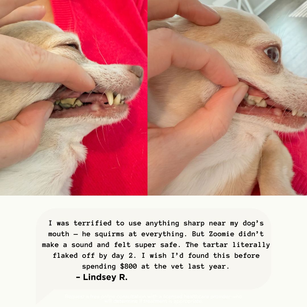 I was quoted over $600 for a dental cleaning and that didn’t include bloodwork or sedation. I couldn’t swing that. A friend told me about Zoomie and I was skeptical, but this is literally what the vet uses, just made safer for home. No stress, no cutting corners the tartar started flaking off in two sessions. My vet was shocked at the difference.”
